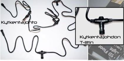 JO78: Haarakytkentäjohto, jossa 5 T-liitintä. Pituus 3m. Viiteen liittimeen voidaan kytkeä 5 lamppua. Sopii tuotteisiin PV01, PV02, PV07,PV08, PV09, GL13, GL14. Väri musta. liittimissä on ruuvattavat kannet ja silikonitiiviste, joka tekee tuotteesta vesitiiviin.